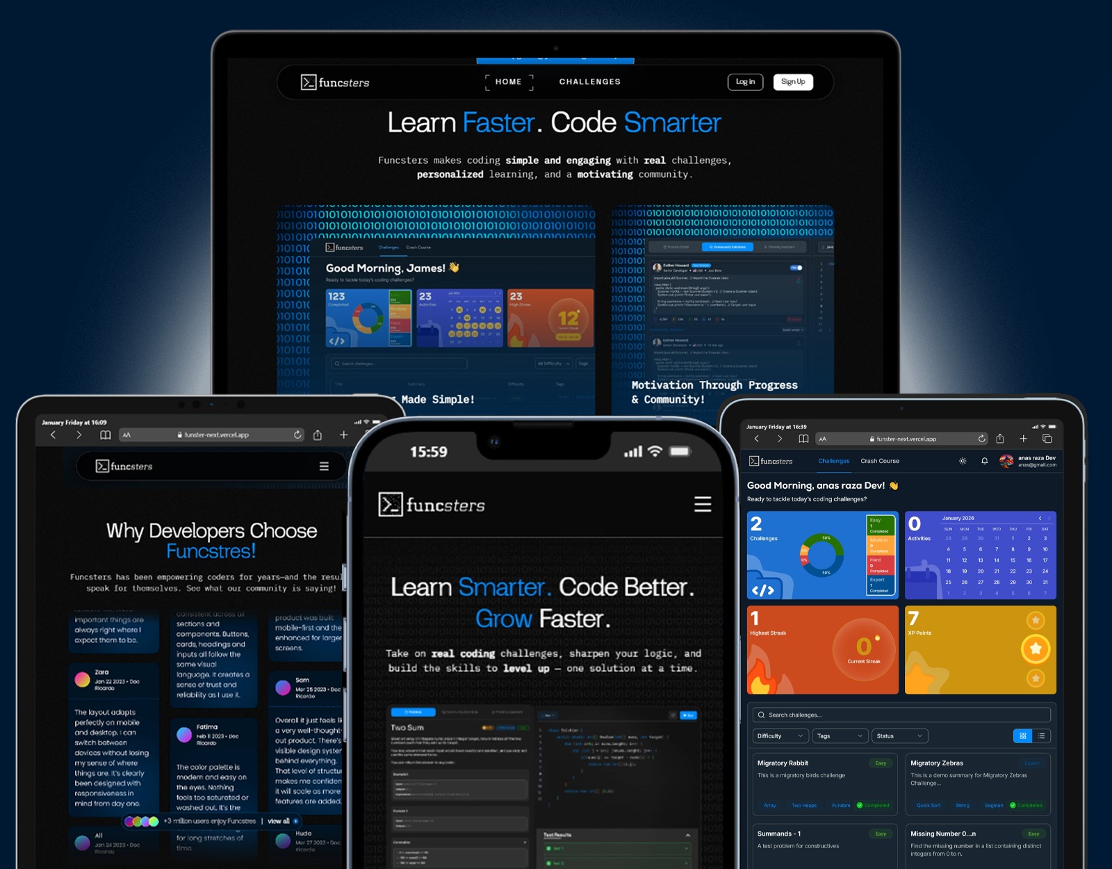 Funcster is a community-driven coding challenge platform where users solve problems, earn XP for solution-first attempts, and track progress through streaks and a calendar-style dashboard.